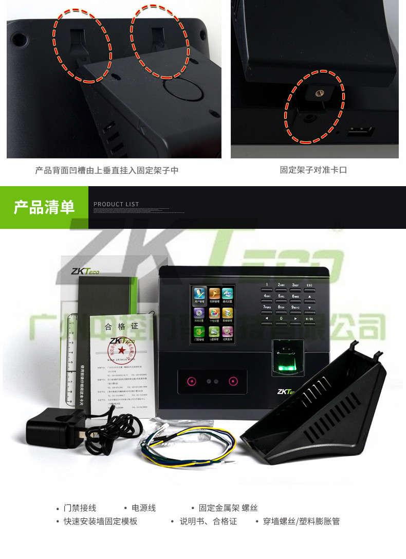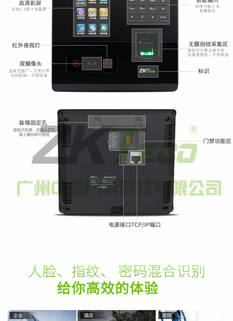 智能密碼門禁UF200特點: 面部容量:200張 指紋容量:400枚 記錄容量:50000條 顯示屏:2.8寸彩屏 考勤速度:小于0.5秒 面部算法:ZKFace VX7.0 U盤功能:U盤上傳下載 考勤照片容量:3000張 通訊方式:USB-Client TCP/IP 其它功能:定時響鈴,9位碼、SSR,簡單門禁功能 輸入法:T9輸入法 電源規格:DC5V 1A 使用濕度:0%-45% 使用溫度:20°C-60°C 尺寸:168(L)x151.5(W)x30(H)mm
