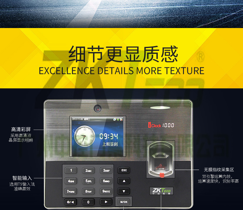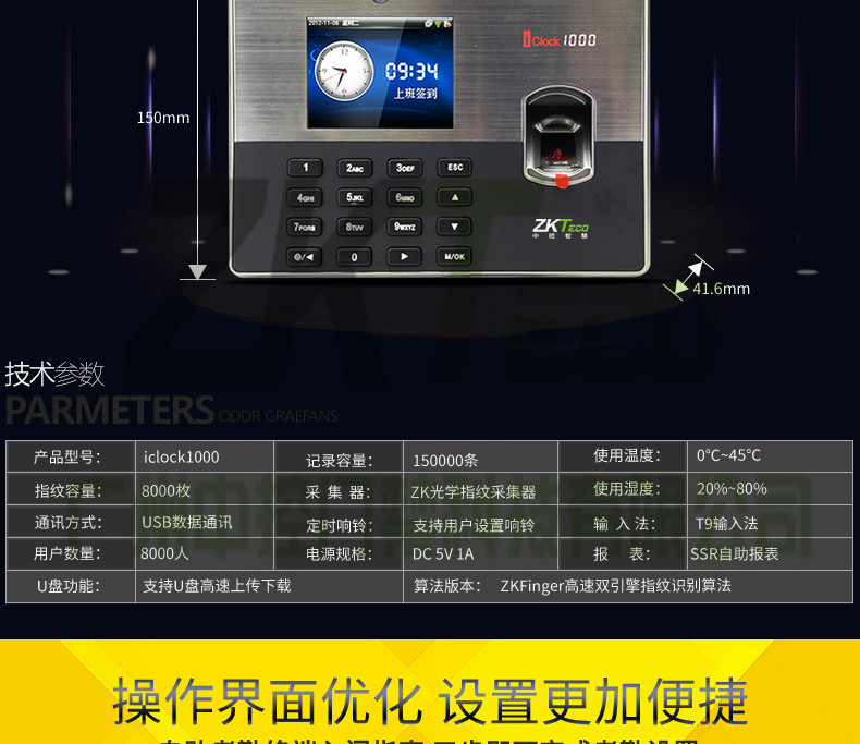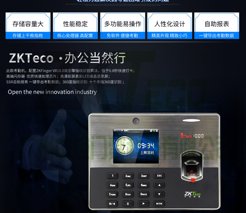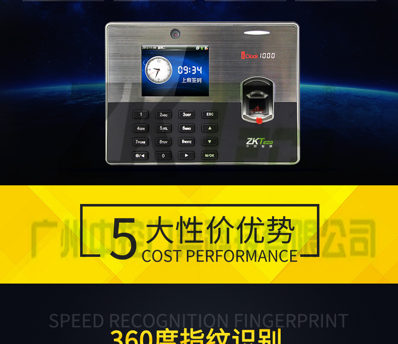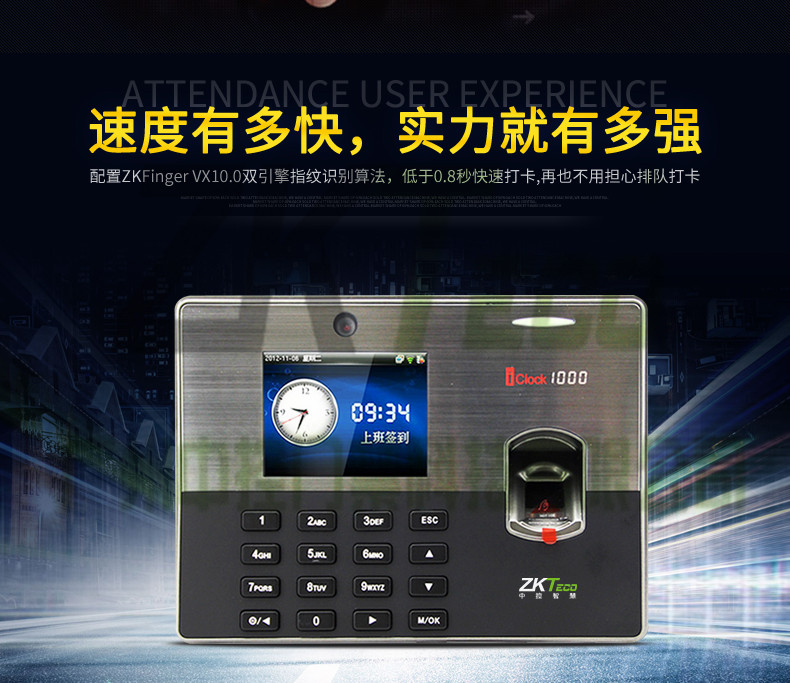 iclock1000是中控科技推出的一款3.5寸彩屏指紋考勤機,該款產品在原來3.5寸彩屏考勤產品的基礎上增加了攝像頭拍照功能,內置130萬像素高淸攝像頭,可以輕松實現員工照片拍攝和顯示,標準的TCPP通訊,經過∪SB「協會認證的U盤下載和cien模式通訊,方便得T9輸入法,對公對私的短消息功能、用戶可自走義的走時響鈴和其高貴典雅的外觀設計,可選配MF、GPRS無線通訊,適合100-500人考勤管理。