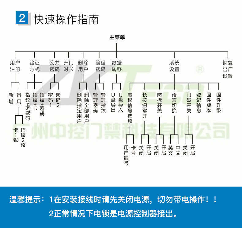 1、初始編程密碼為:9999。 2、編程狀態(tài): 按 * 編程密碼 # 進(jìn)入編程狀態(tài)。按 * 可退出編程狀態(tài) ,或者無任何操作十秒鐘后自動(dòng)退出。 3、按鍵說明: 【*】按鍵為進(jìn)入或退出編程模式 【#】按鍵為確認(rèn)鍵或門鈴按鈕 【2】、【8】按鍵進(jìn)入多級(jí)菜單后為上翻與下翻鍵 4、使用方法: (1)正常工作狀態(tài)按用戶指紋、讀用戶卡或輸入正確的開門密碼即可開門。 (2)如果忘記編程密碼了,可以把門禁機(jī)拆下來恢復(fù)編程密碼。 (注:如要?jiǎng)h除全部用戶信息,需進(jìn)入主菜單,進(jìn)行“恢復(fù)出廠設(shè)置”)